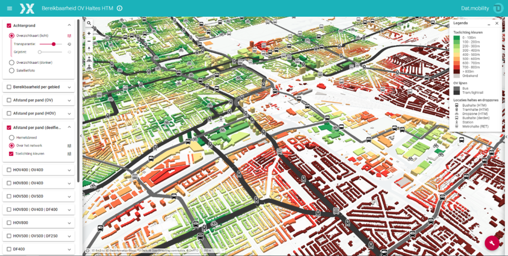 Deze analyse gaf inzicht in de loopafstanden, vanaf ieder gebouw naar het dichtstbijzijnde mobiliteitspunt. De resultaten van de studie zijn ontsloten via een interactieve kaart in OmniTRANS Analytics. Deze online omgeving biedt de mogelijkheid om op een zeer aantrekkelijke wijze de uitkomsten van de analyses te delen met diverse stakeholders, bijvoorbeeld tijdens werksessies met gemeenten binnen het vervoergebied, of met MT-leden.