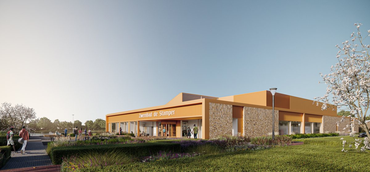 Impressie van het nieuwe zwembad in Vriezenveen (Ontwerp: Slangen+Koenis architecten | Visual: DMOO)
