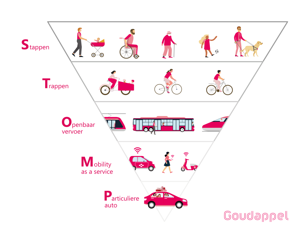 STOMP staat voor Stappen, Trappen, Openbaar vervoer, Mobility-as-a-Service en Privéauto. Het is een ordeningsprincipe dat helpt om keuzes in mobiliteit en ruimte te prioriteren. Eerst ruimte voor lopen, daarna fietsen, vervolgens openbaar vervoer en gedeelde vormen van vervoer, en pas daarna de privéauto.