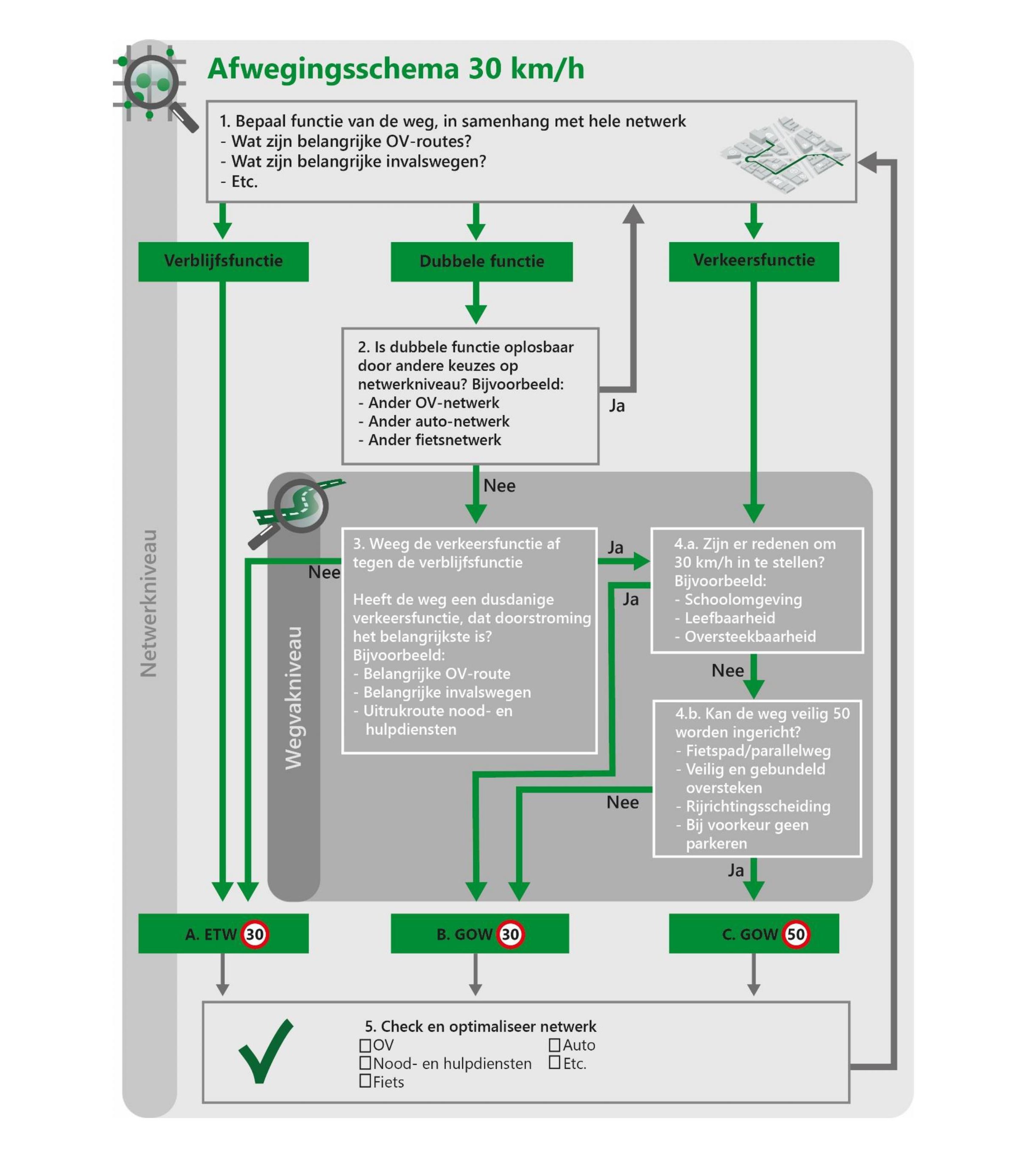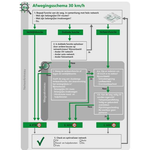 Dit afwegingskader is door Goudappel en DTV opgesteld voor CROW. Met behulp van het bijbehorende afwegingsschema kunnen wegbeheerders in vijf stappen bepalen welke wegen in aanmerking komen voor 30 km/u. Beide zijn ook onderdeel van de gereedschapskist.