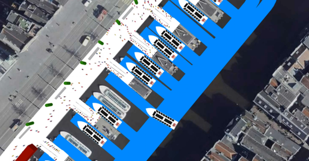 Inzicht in drukte rondvaartboten met loopstromenmodel Damrakkade Amsterdam